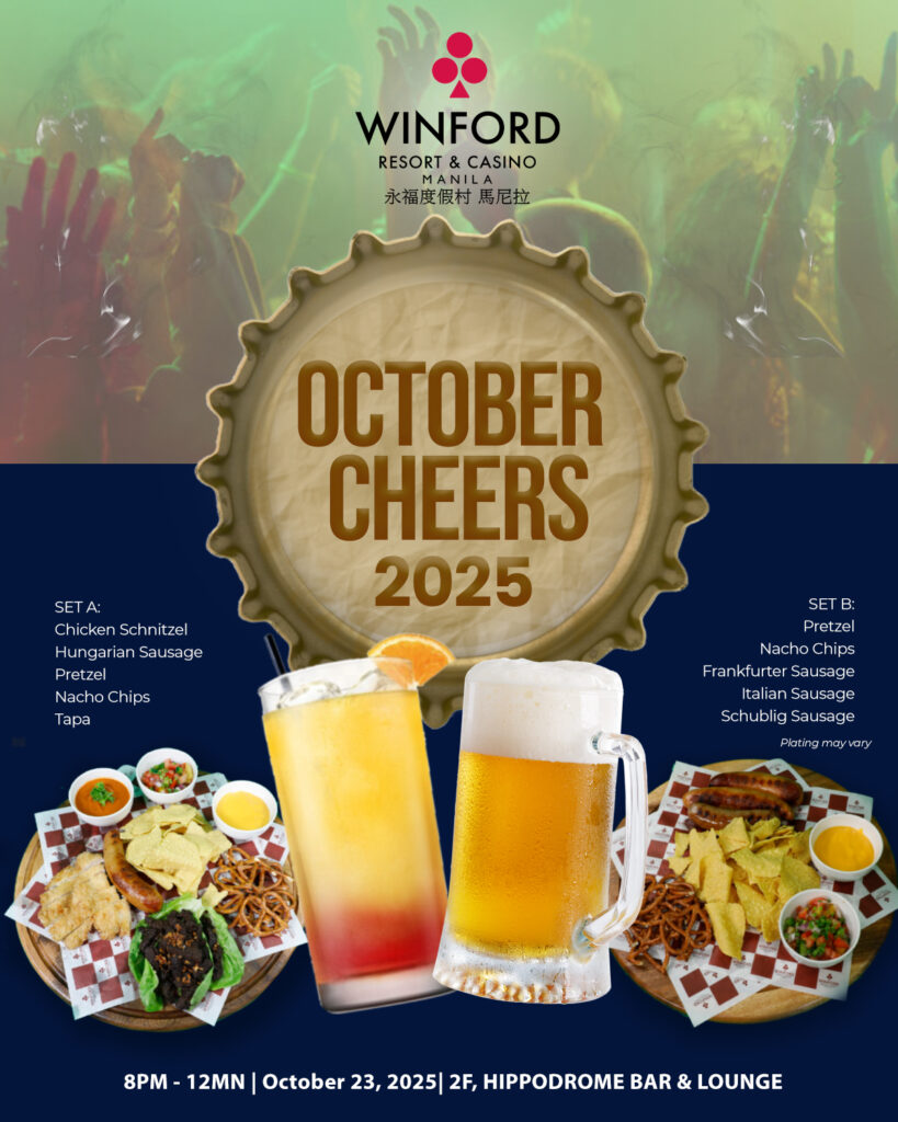 What’s October without the famous feast of food and drinks? Winford Resort & Casino Manila brings you October Cheers 2025. For only Php1,250.00 per head, you can enjoy delectable sausage platter, unlimited tequila sunrise and draft beer ‘till midnight, and special performances from Mocha Girls and Bandang Grace. Don’t miss it on October 23 at the Hippodrome Bar & Lounge.
