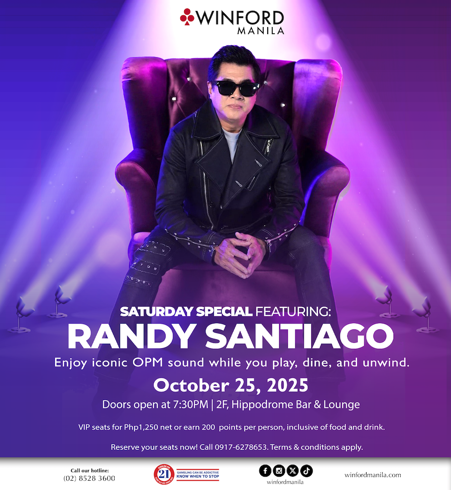 Put on your shades and relive iconic OPM sounds with pure entertainment at Winford Manila’s Saturday Special featuring Randy Santiago with The Private Eyes Band. Catch him live on October 25, 7:30PM at the Hippodrome Bar & Lounge. VIP seats for Php1,250.00 net or 200 points per person are inclusive of food and drinks.