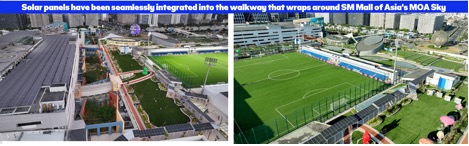 Across the SM Mall of Asia’s MOA Sky, solar panels have been seamlessly integrated into the walkway that wraps around the property—doubling as overhead covering for mallgoers strolling and enjoying leisurely walks.