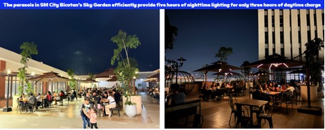Another innovative application of means to harness solar power can be found in SM City Bicutan’s solar-powered parasols decorating its Sky Garden. The understated use of the solar-powered parasols not only add to the Sky Garden’s ambience but also provides functional use as nighttime lighting for customers of surrounding establishments.