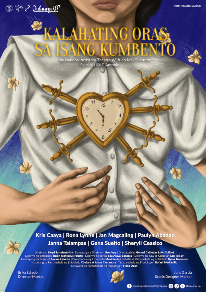 UP Diliman Theatre Arts student Lloyd Sarmiento Uy serves as director, alongside director-mentor Erika Estacio. The cast includes Kris Caaya, Rona Lynne, Jan Magcaling, Paulyn Abando, Janna Talampas, Gena Suelto, and Sheryll Ceasico.