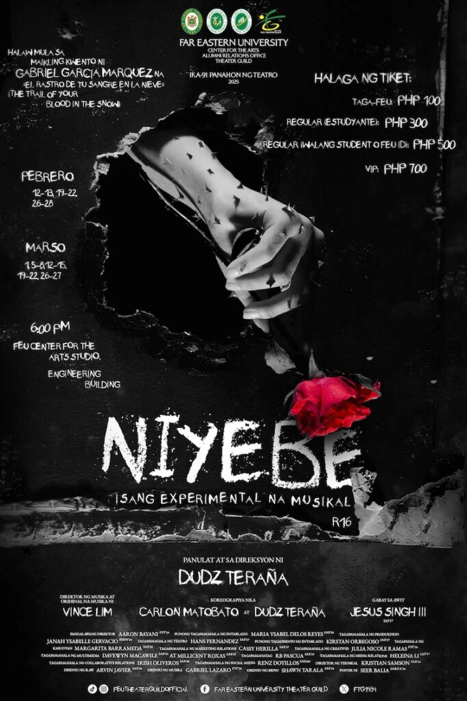 With a unique blend of captivating performances, evocative music, and innovative design, Niyebe is more than just a musical—it’s a deeply moving exploration of love and loss. It will run at the FEU Center for the Arts Studio on the following dates: