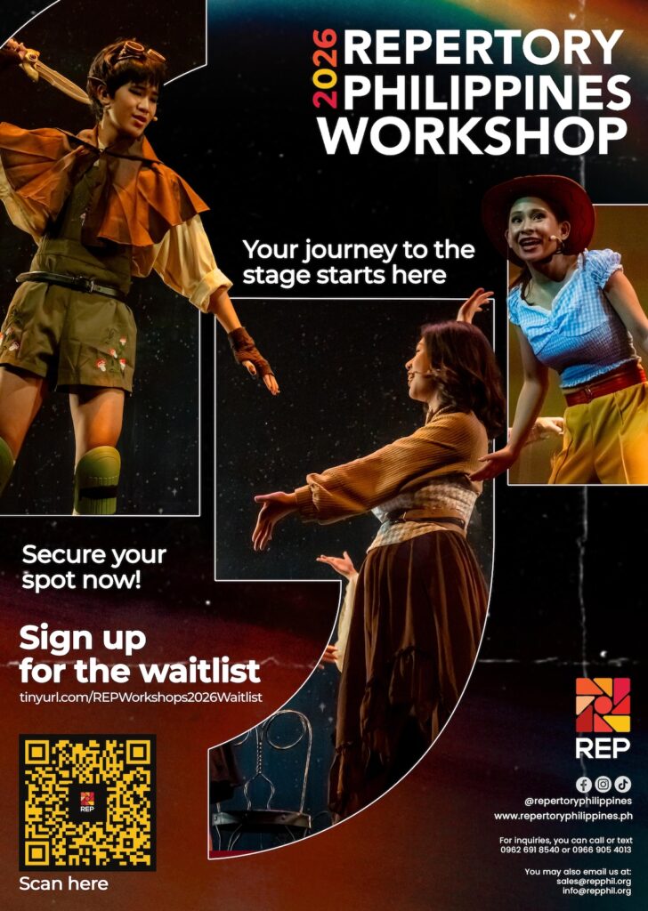 The REP Workshop for the Performing Arts will have 2 sessions, with Session 1 from April – May 2026 at the REP Eastwood Theater, and Session 2 from June – July 2026 at MINT College in McKinley, Taguig. Slots run out fast so sign up for the waitlist here https://tinyurl.com/REPWorkshops2026Waitlist as soon as possible.