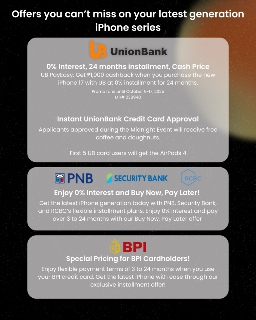 - PNB, Security Bank, and RCBC: Provided flexible installment plans with 0% interest over 3 to 24 months through their special Buy Now, Pay Later offer, making the iPhone 17 purchase effortless.