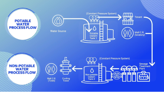 SM Supermalls embeds water conservation practices across its operations. Recycled water is used in water closets for flushing, cleaning, and watering greens. Additionally, efficient low-flow fixtures and water-saving technologies prevent unnecessary consumption at scale.